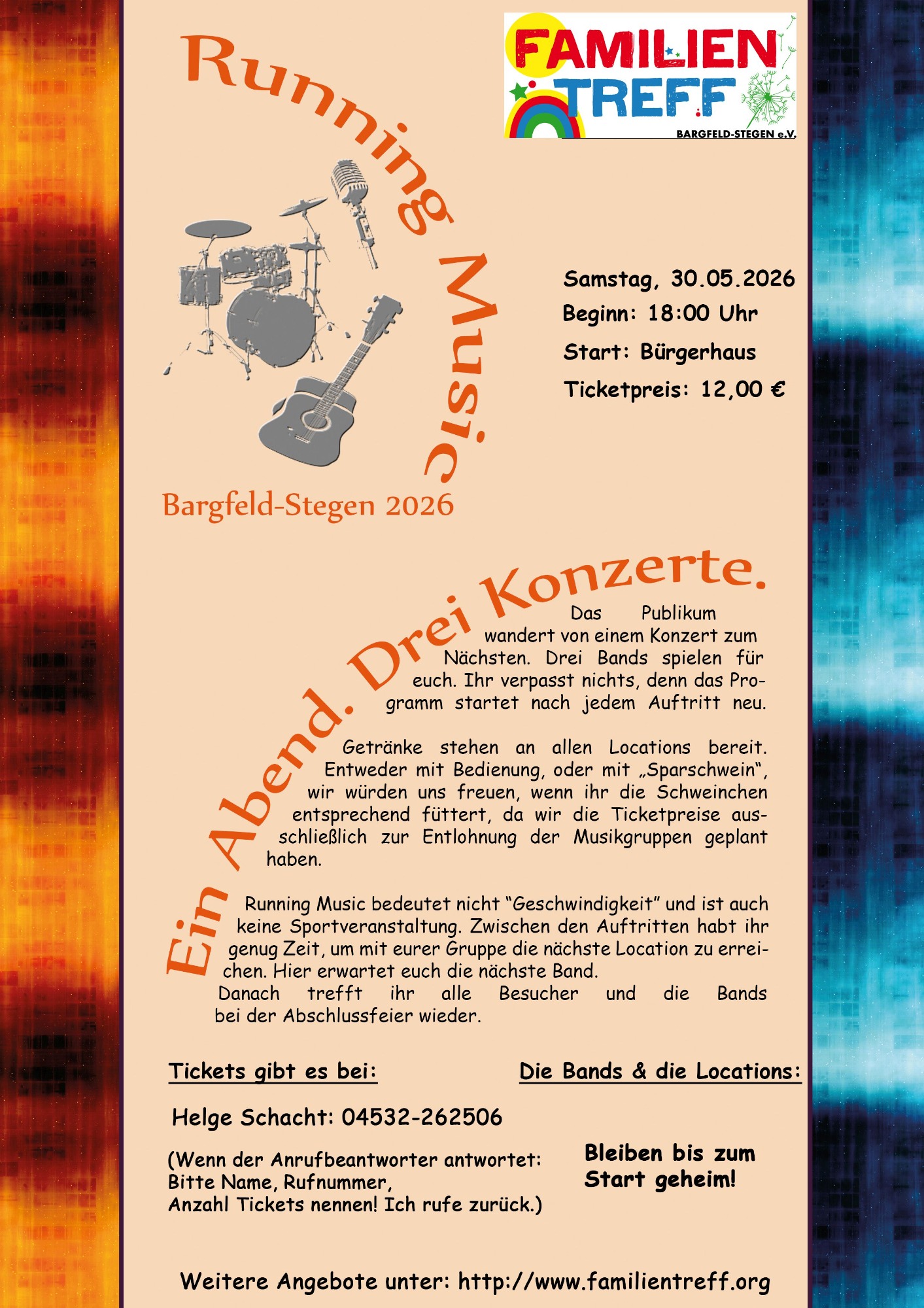 Das Publikum wandert von einem Konzert zum Nächsten. Drei Bands spielen für euch. Ihr verpasst nichts, denn das Programm startet nach jedem Auftritt neu. Getränke stehen an allen Locations bereit. Entweder mit Bedienung, oder mit „Sparschwein“, wir würden uns freuen, wenn ihr die Schweinchen entsprechend füttert, da wir die Ticketpreise ausschließlich zur Entlohnung der Musikgruppen geplant haben.